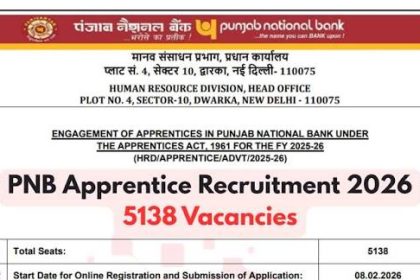 पंजाब नेशनल बैंक (PNB) ने अपने अप्रेंटिसशिप कार्यक्रम के तहत 5,138 पदों…